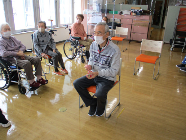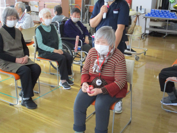 今回は鬼をめがけて、球を投げ入れる特性「的当てゲーム」。開始前、職員が「上位入賞者には豪華景品があります!」とアナウンスした瞬間、会場の空気は一変。皆様の目がキラリと勝負師の顔に変わったのが印象的でした。