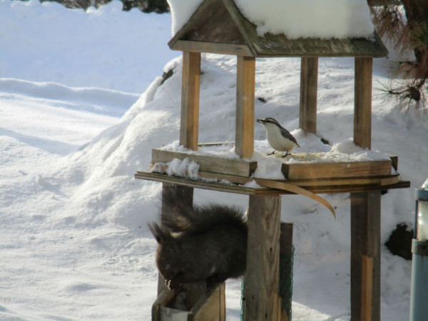 利用者様から吸盤で窓にくつける透明の小鳥用の餌箱を作って頂きました。エゾリスが小鳥用の餌箱に入り、餌を食べている最中、重みに耐えられず餌箱ごと落ちてしまい、大パニックで山へ逃げかえる姿もありました。さぞ驚いたことでしょうね。利用者様からは「リハビリをしながら野鳥やエゾリスを見れて幸せだ。初めて見た!」と嬉しいお言葉が聞かれました。