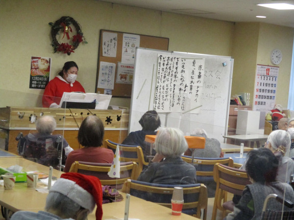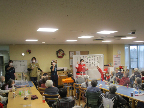 入所フロアではクリスマス会を実施しました。会ではクリスマスにちなんだ音楽を聴きながら、皆さまお手製のマラカスを鳴らしコンサートのような時間を楽しまれていました。